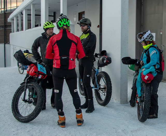 Friday was kit check day and pre race meeting. I caught up with Bob and Cath Wightman in race control as well as Mike who was also doing the 150. Simon and Lisa Marie were running the 66k route and there were a number of other Brits present. The race briefing focussed rather heavily on overflow. This is something experienced on frozen water bodies whereby the ice cracks allowing water to force its way up under the over lying snow. The snow can insulate this water preventing it from freezing straight away so you end up with a bizarre scenario of splodging through slushy snow even at serious sub zero temps. This then freezes jamming drive trains solid.... In the temps forecasted there was no danger of this but also no chance that any over flow would re-freeze. I felt a distinct churning in my stomach hearing all of this but there was nothing we could do other than to ride (or walk) through it all and hope for the best